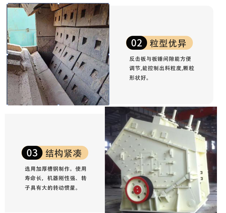 2、產品粒型好,反擊板與板錘間隙能方便調節,控制出料粒度;