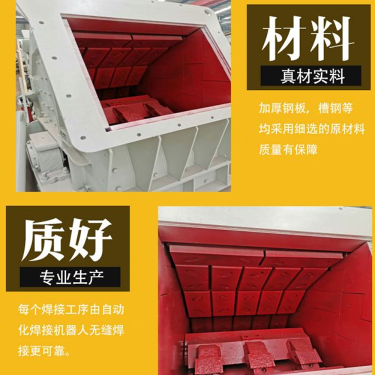 3、反擊式破碎機的板錘采用高鉻材質,具有良好的抗沖擊、抗磨損性能,能夠保持排料粒度穩定。