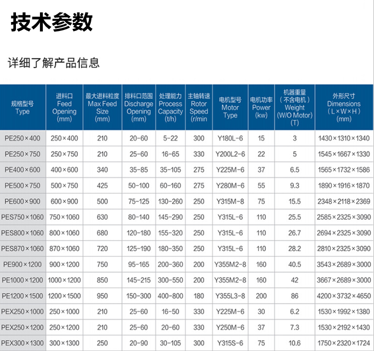 破碎機(jī)按其外形規(guī)格尺寸及時(shí)產(chǎn)量高低的不同,常可劃分出很多規(guī)格型號(hào),另外,為了滿(mǎn)足部分高要求客戶(hù)生產(chǎn)需求,市場(chǎng)現(xiàn)又推出了一類(lèi)移動(dòng)式鄂破機(jī),鄂破機(jī)參數(shù)詳情如下表: