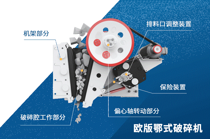 顎式破碎機主要由機架、工作機構、傳動機構、調節裝置、拉緊裝置,保險裝置和潤滑系統組成: