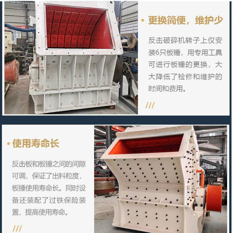 反擊式破碎機(jī)適于處理中等硬度物料,例如石灰石、煤矸石、方解石等;主要部件為轉(zhuǎn)子與反擊板,采用擊打式作業(yè)原理,通過將物料不斷地拋起落下、研磨等以達(dá)到破碎效果,生產(chǎn)的成品具有粒型好、多角多棱、石粉少等特點(diǎn),用戶還能通過調(diào)節(jié)板錘與反擊板之間的間隙控制粒度。